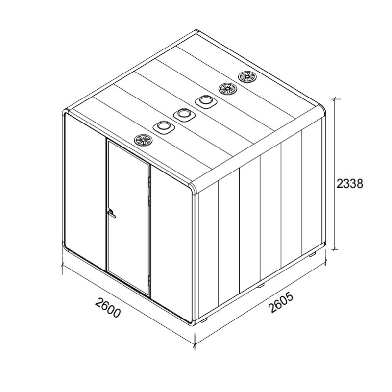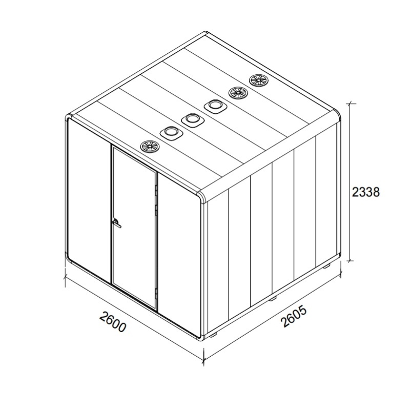 | Tamaño exterior: | W2600*D2605*H2338 mm | Materiales: | Acero, aluminio, placas acústicas de fibra, vidrio laminado |